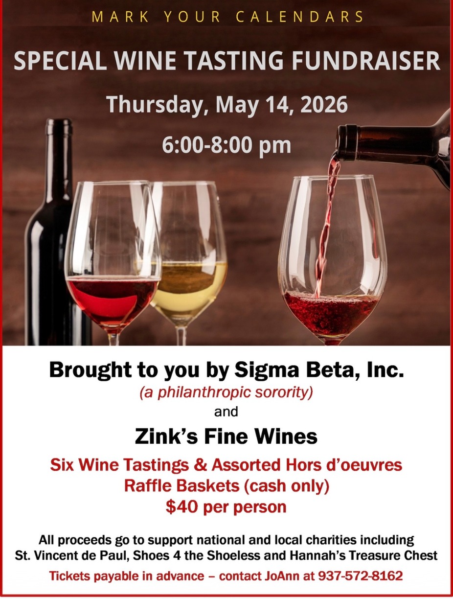Fundraiser Thursday May 14 2026. Special Wine Tasting. Event includes six wines to taste, hors' doeuvres, raffle baskets. $40 a ticket. All proceeds go to support national & local Charities including St. Vincent de Paul. Contact JoAnn at 937-572-8162 for tickets.